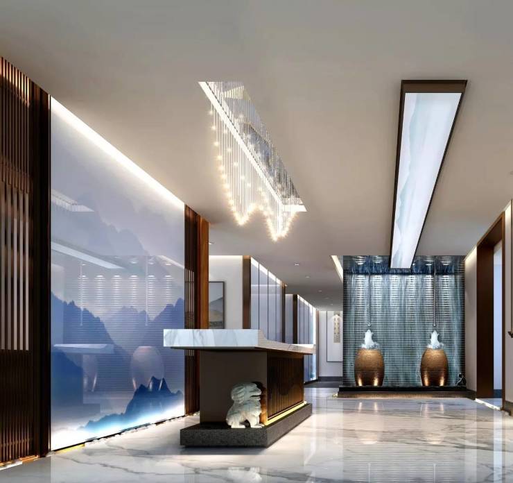 項目采用了禪意文化的手法進行設(shè)計,這個空間即融入了中國傳統(tǒng)風(fēng)格文化與現(xiàn)代時尚之中,既有中式的古香古色,又有現(xiàn)代的簡單自然,東方韻味在現(xiàn)代的背景下若隱若現(xiàn),簡約的中式造型與現(xiàn)代形式轉(zhuǎn)變?yōu)槭孢m,實用,為現(xiàn)代辦公設(shè)計重重的添了一份古典的韻味。禪意辦公室大廳設(shè)計:以現(xiàn)代手法將古典語言融入中式意境,整個空間散發(fā)出悠然禪文化。頂上一通而過燈飾造型,如同一條河流,在對面機刨石上如瀑布般潺潺流下,兩個古樸的老缸不停地冒著噴泉。用較少即多的表現(xiàn)方式直接明了的體現(xiàn)了整個空間文化氛圍,留白的墻,黑色原始頂,現(xiàn)代中式家具與禪意的辦公桌,在現(xiàn)代與傳統(tǒng)的相碰中呈現(xiàn)出了一個既有文化又有時尚感的辦公空間。