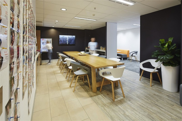 5、服裝公司辦公室裝修設(shè)計:接待處位于底樓的正門,設(shè)有休息室和會議空間,可容納訪客。接待區(qū)周圍的定制墻板模仿了織物的褶皺,并為零售品牌的工作場所提供了設(shè)計敘事。提供各種團體座位安排的所有團隊成員的共用食堂位于地下室。開放式辦公室和休息區(qū)沿著面向公園一側(cè)的全高立面玻璃排列,使員工在工作期間可以欣賞郁郁蔥蔥的綠色美景。玻璃隔斷用于將會議室、私人櫥柜與開放辦公室分隔開來,充分利用自然光線,創(chuàng)造一個透明通風(fēng)的工作場所。白色、灰色和黑色的基本色調(diào)與天然的木材和石材表面作為重點,為工作場所的創(chuàng)造性工作創(chuàng)造了一個干凈和舒適的背景。墻面紡織面板和天花板護罩可確保共享空間和封閉空間所需的聲學(xué)特性。