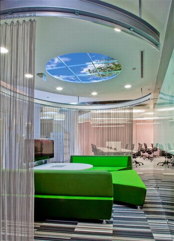 4、國(guó)外創(chuàng)意工業(yè)園區(qū)辦公室裝修設(shè)計(jì):天棚采用玻璃鏤空,增加室內(nèi)亮度,造型迥異,增強(qiáng)視覺(jué)沖擊力。