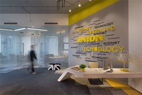 1、600平方互聯(lián)網(wǎng)公司辦公室前臺(tái)設(shè)計(jì)的時(shí)候,由于空間自身具有其優(yōu)點(diǎn)——頂相對(duì)高,設(shè)計(jì)師希望可以將這個(gè)優(yōu)點(diǎn)聚焦加以放大,設(shè)計(jì)師將前臺(tái)設(shè)計(jì)成類似弧形的四分之二圓,同時(shí)放低其高度,讓墻壁可以完后自己的使命——形象墻,讓前臺(tái)空間的屬性可以在此基礎(chǔ)上承擔(dān)更多的責(zé)任。