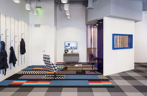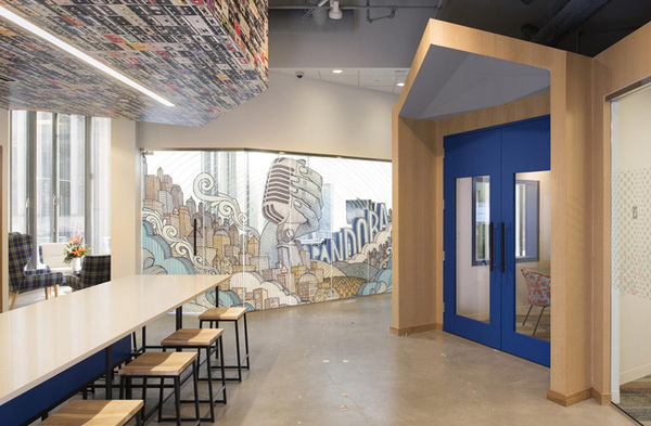 開放性的辦公區(qū),設計師使用餐廳質感的訂制家具,取代以往的OA辦公家具,讓員工作業(yè)可以更加舒適愜意。設計師特別為業(yè)主規(guī)劃斜角天花及專業(yè)隔音系統(tǒng),讓每次聆聽音樂都是一場享受。