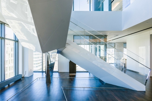 打造了一個(gè)靈動(dòng)、多元、開放共享的辦公空間,設(shè)計(jì)了一座戲劇化的中央樓梯將上下兩個(gè)樓層連接起來。沿窗放置了一些皮質(zhì)長(zhǎng)凳,為周邊營(yíng)造更開闊的動(dòng)線空間,也讓室外的自然光照**限度地灑入室內(nèi)深處。