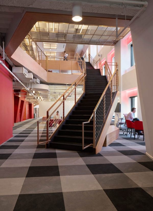 為了消除樓層間的孤立感,設(shè)計(jì)師創(chuàng)建一個活力動態(tài)的工作空間,打造了共享中庭并增加一座連接各個樓層的中庭樓梯。設(shè)計(jì)以枝繁葉茂、盎然生機(jī)的“大樹”為概念,蓬勃伸展至各個樓層,衍生出本案的幾何形空間裝飾語言,由中央核心向周邊與頂面呈樹枝狀蔓延擴(kuò)展。