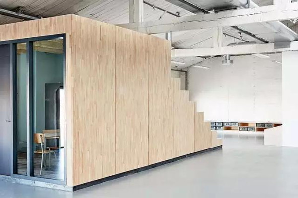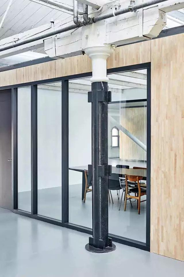 木與鋼的構(gòu)造定義了這個開放的辦公空間。封閉會議室和網(wǎng)絡(luò)電話間,由之前租戶**下來的窗框改造而成。經(jīng)過再利用和重新粉刷,這些舊窗框的尺寸定義了新的會議室的大小和設(shè)計風(fēng)格。墻面再飾以橡膠木,這是之前橡膠工廠的廢棄物。粗獷的鋼材與溫暖的木肌理在這個舊工業(yè)廠房空間里形成了強烈的材質(zhì)對比。而那些原封不動的梁架和墻體則繼續(xù)延續(xù)著建筑的歷史脈絡(luò)。