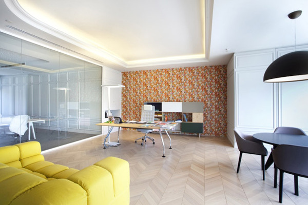 洽談室的設(shè)計(jì),設(shè)計(jì)師采用了白色、灰色、黃色、黑色顏色之間的轉(zhuǎn)換,來體現(xiàn)洽談室的價(jià)值,人體對(duì)顏色很敏感,多種顏色經(jīng)過設(shè)計(jì)師的重新搭配,更顯得時(shí)尚、創(chuàng)新。