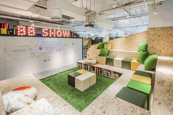 交流區(qū)域的設(shè)計(jì),設(shè)計(jì)師將交流區(qū)域設(shè)計(jì)在辦公區(qū)域的中央?yún)^(qū)域,一則此處完全是個(gè)多元化的空間,既可以滿足全公司集中在一起開大會(huì)議,同時(shí)視線極好,閑時(shí)此空間成為大家就近的休憩之所。