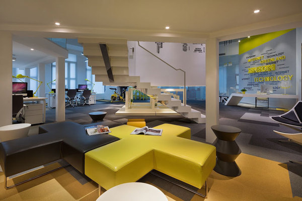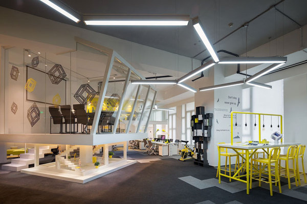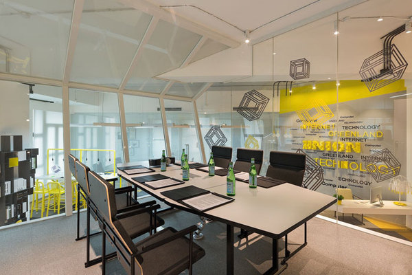會(huì)議室的設(shè)計(jì),設(shè)計(jì)師將其安置在空間的中心,一則做為企業(yè)的亮點(diǎn)存在,二則懸空的空間給人以俯視的感覺,本空間不論是內(nèi)部還是外部都攜帶創(chuàng)意的屬性,這樣的空間使人靈感無限。