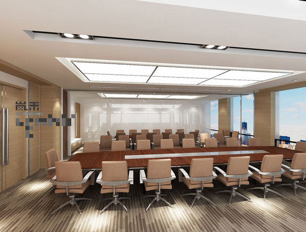 會議室的設計,設計師一邊利用窗簾來調節(jié)視覺效果,同時在另外兩側安排條形桌,來擴充不同的人員參會,設計上也是由淺及深,整個空間顯得比較沉穩(wěn),嚴肅而靜謐。