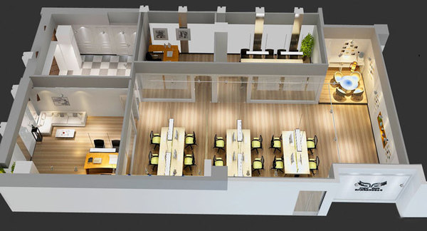 俯視圖:通過以上的俯視圖大家對于空間會有一個直觀的認識,企業(yè)品牌設(shè)計在外部墻面,經(jīng)過進門區(qū)域進入辦公室,首先經(jīng)過的就是形象墻,到達打印茶水區(qū)域,通過動線拐彎經(jīng)過開放式辦公區(qū)域與會議室、副經(jīng)理辦公室,**到達總經(jīng)理辦公室與拍攝區(qū)域。