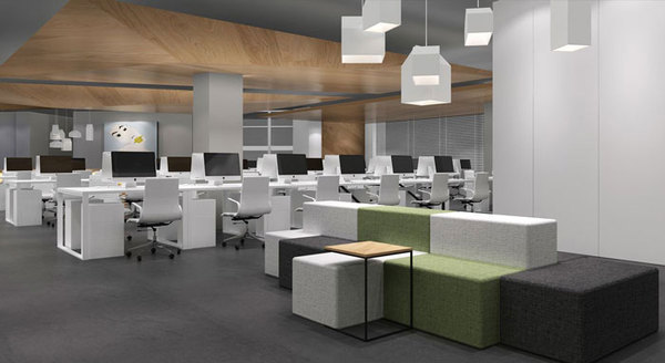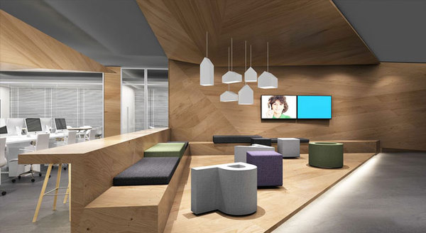 辦公區(qū)域的設(shè)計(jì),設(shè)計(jì)師主要為了突出交流功能,以固定的工作位置來增強(qiáng)團(tuán)隊(duì)合作的便利性。