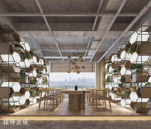 接待區(qū)域的設(shè)計(jì):設(shè)計(jì)師在設(shè)計(jì)的時(shí)候,將其設(shè)置在一個(gè)湖光山色的自然空間,設(shè)計(jì)師希望通過這樣的設(shè)計(jì)拉近企業(yè)與顧客之間的關(guān)系,同時(shí)讓客戶對企業(yè)產(chǎn)生一種莫名的信任感,在交流的過程中不斷的了解對方,為下一步的合作留下契機(jī)。