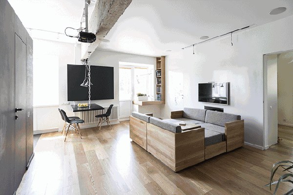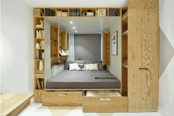 看似簡潔的天花板其實(shí)是供晚上睡的床。