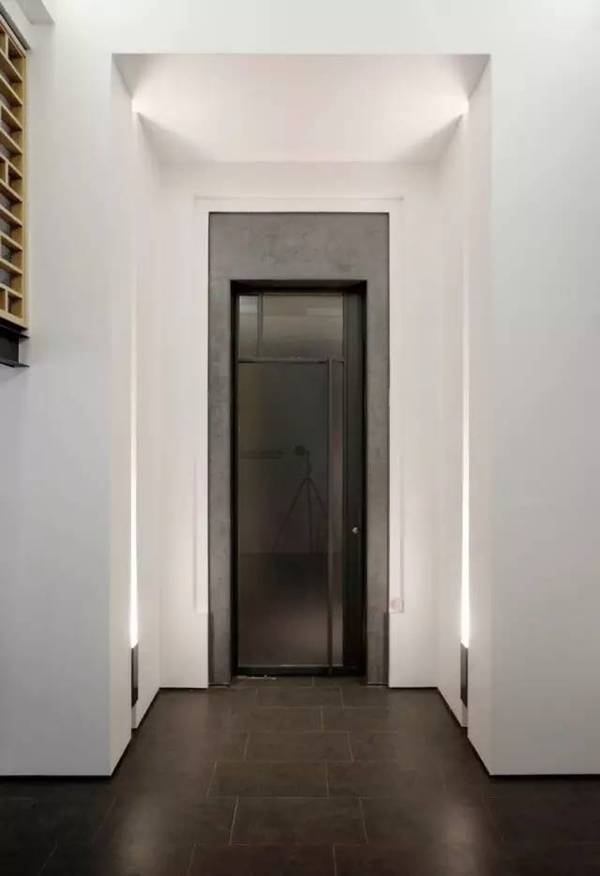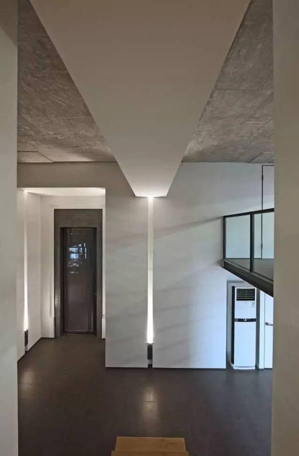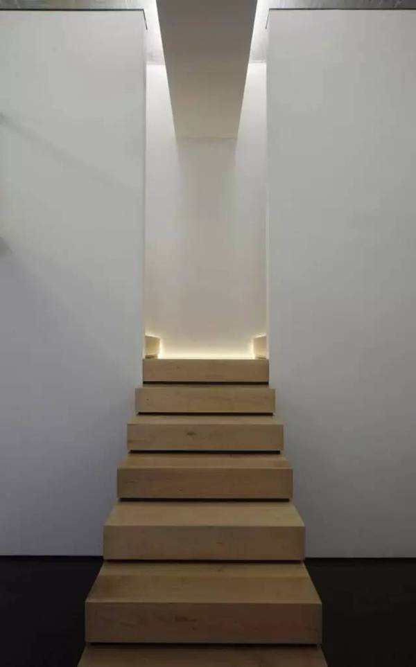 樓梯在中間往兩側(cè)分開,在高高的白墻中間,如同一道通往別處的裝置,吸引觀者登梯探訪。通過白墻和天花間露出的微光,可以看到白墻并未真正與墻接合,且邊緣用鋼條鑲嵌,展露出更鮮明挺拔的體塊形狀。為了提升空間的立體感,門廳沒有設(shè)置照明設(shè)備,唯有從遠處墻壁的燈柱迎來的淡淡白光,令觀者一進門即在這份寧靜中得到放松。