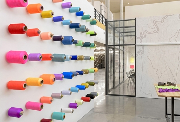因?yàn)槭沁\(yùn)動(dòng)服飾研發(fā)公司,因此類(lèi)似面料、橡膠、紗線(xiàn)、還有鞋子等物品即需要儲(chǔ)存的地方,也要便于隨時(shí)觀摩。儲(chǔ)物柜是一種解決方案,但O+A提出更好的創(chuàng)新方案。當(dāng)設(shè)計(jì)團(tuán)隊(duì)在現(xiàn)場(chǎng)考察的時(shí)候被儲(chǔ)物盒中靚麗的紗線(xiàn)色彩所吸引。一個(gè)個(gè)漂亮的線(xiàn)軸被精心裝飾于墻面上,形成一道裝置藝術(shù)墻。
