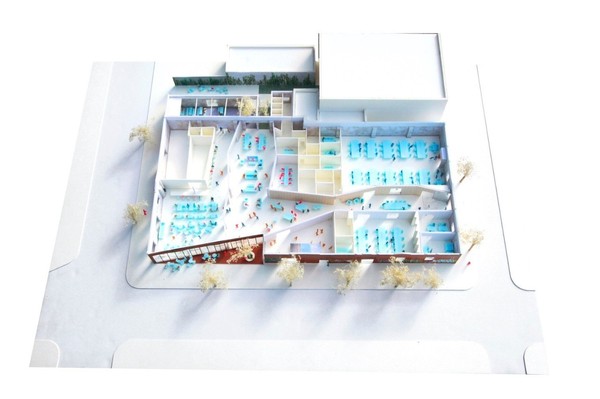 這樣的設(shè)計手法,給予室內(nèi)空間相互關(guān)聯(lián)。同時,設(shè)計者還對建筑入口進(jìn)行了從視覺化的處理,移除面向西南角的三角形的區(qū)域,改為透明的立面,將被涂鴉的磚墻重新組裝,以制造出不同的涂鴉樣式,以此表現(xiàn)建筑以及社區(qū)間層層疊加以及穿插的歷史。