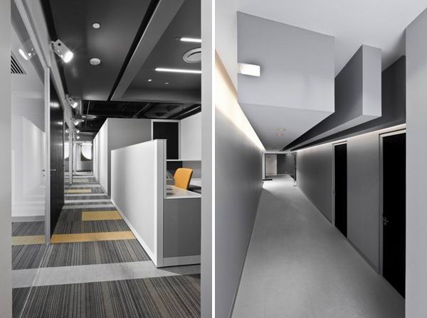辦公室設(shè)計的辦公區(qū)域和走廊,灰色也不會顯得單調(diào)?;疑梢允堑匕?,作為整個空間的輔助;也可以是主體,就像兩側(cè)墻壁上明暗不同的灰色組成的圖畫,吸引眼球。