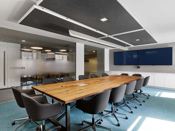 清朗凝練的空間更多了一份雍容典雅的都市氣質(zhì),依舊以藍(lán)色標(biāo)志色為裝飾主調(diào),只是這次的藍(lán)色更暗雅、更富于細(xì)膩的變化。極富質(zhì)感的白蠟?zāi)静馁|(zhì)與黑色碳鋼構(gòu)件制作的家具,呈現(xiàn)出特有的都市氣質(zhì)。閉合的洽談室和會(huì)議室大多聚集于空間的內(nèi)部,以盡可能留出沿窗的空間令視線不被遮擋。連續(xù)而開(kāi)敞的玻璃窗,讓室外城市美景盡收眼底,心情也變得豁然開(kāi)朗。