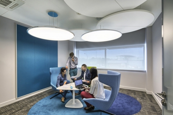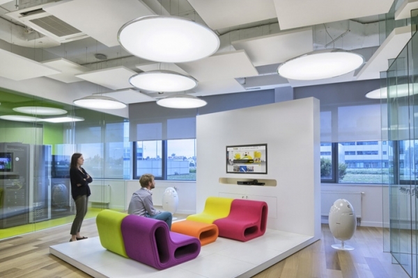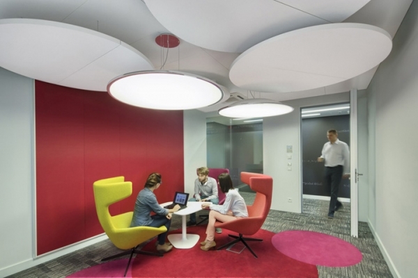 多彩的協(xié)作空間,圓形的頂與圓形的燈上下交錯(cuò)構(gòu)筑了一個(gè)動(dòng)感有趣的視覺空間,并與地面圓形的地毯形成形式上的呼應(yīng);而墻面局部點(diǎn)綴的色彩也與彩色地毯相映成趣。流暢的圓弧造型和曲面高靠背椅帶來柔和優(yōu)雅的工作氛圍。