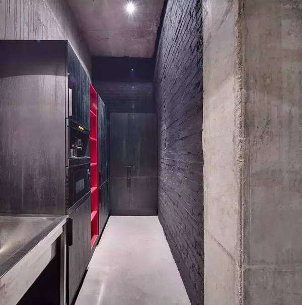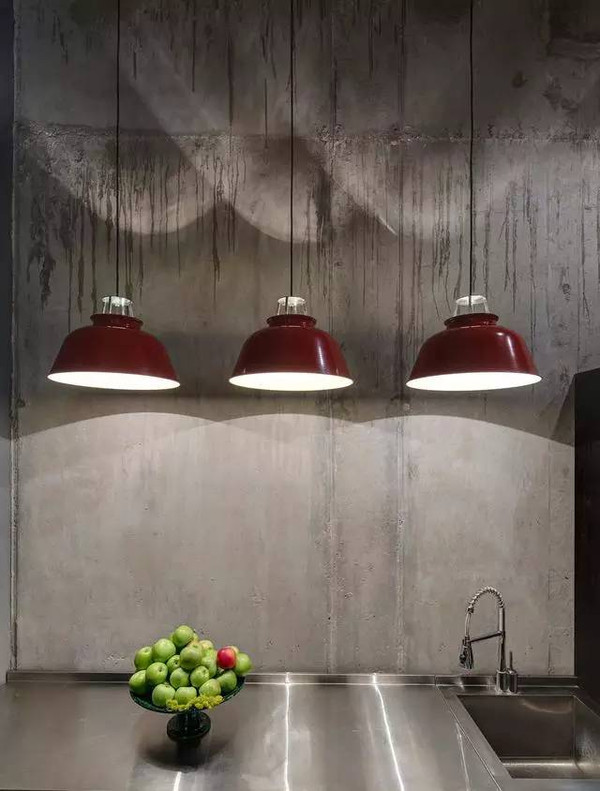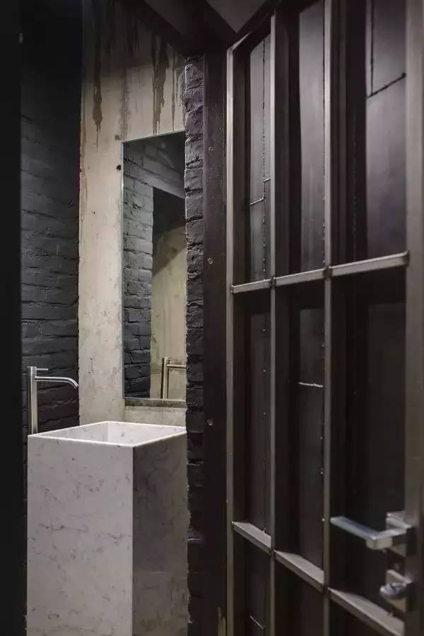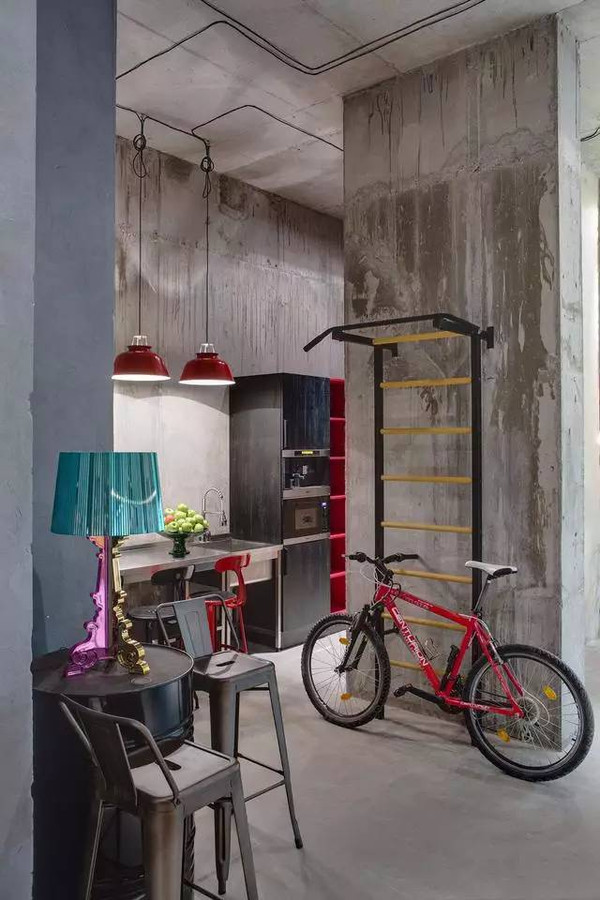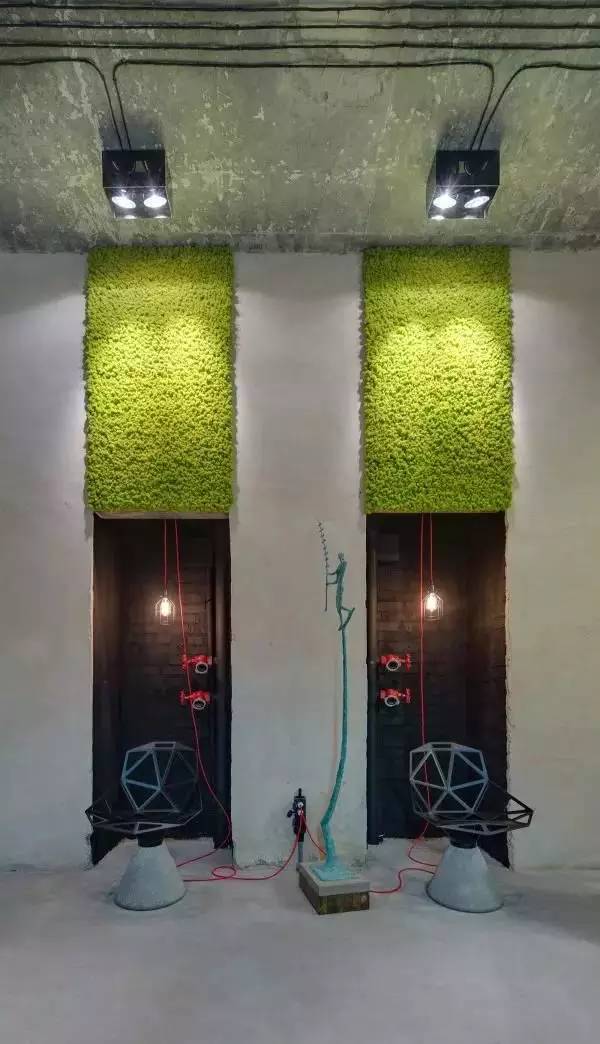 裸露的水泥墻面和水管閥門,被很好的歸納起來,成為了裝飾墻,綠色的塊毯成了一個亮點被掛在墻上,效果相當棒