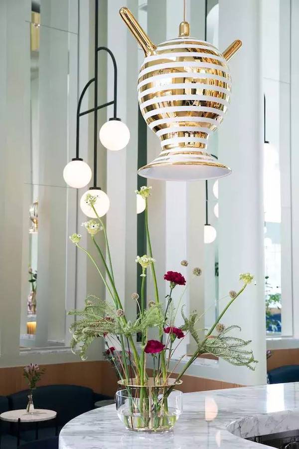 值得注意的是,除了椅子之外,旅館里包括燈飾、桌子以及大大小小的裝飾物都是 Masquespacio 團隊專門為其設計的,幾何圖形與色彩的組合與碰撞幾乎隨處可見,既是 Masquespacio 的標志性風格,也強化了瓦倫西亞休閑旅館的辨識度。