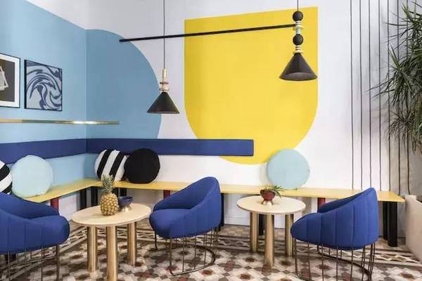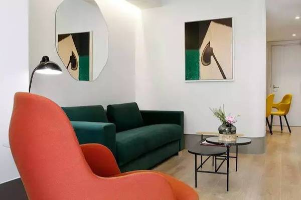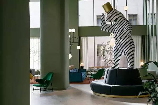 用色毫不膽怯,單單是酒店大堂中的沙發(fā),就有紅、綠、藍、粉、灰等六七種顏色;淺綠色和深紅色的沙發(fā)被特意組成了一對,擺放在一起,卻沒有艷俗感。