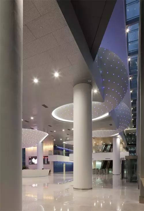 運(yùn)用現(xiàn)代簡(jiǎn)潔的設(shè)計(jì)手法,高雅明快的色調(diào),精致和諧的材料,設(shè)計(jì)師成功營造出一個(gè)純粹干凈的國際化企業(yè)空間氛圍。中性高雅的色調(diào)成為空間的背景,而一些高科技的設(shè)備及材料:比如激光投射燈、穿孔金屬板的運(yùn)用,則表現(xiàn)出信息時(shí)代敏銳、高速的特色。通過合理組織參觀流線,有效串聯(lián)功能空間,設(shè)計(jì)強(qiáng)化了室內(nèi)環(huán)境與內(nèi)院環(huán)境、室外環(huán)境的聯(lián)系與互動(dòng),做到空間次序明確同時(shí)各部門又各具特色。建筑良好的視線及引入建筑的陽光、綠化,則充分與小型討論區(qū)、會(huì)議單元、咖啡區(qū)休息區(qū)結(jié)合起來,使辦公環(huán)境輕松化、特色化、人性化。