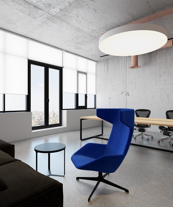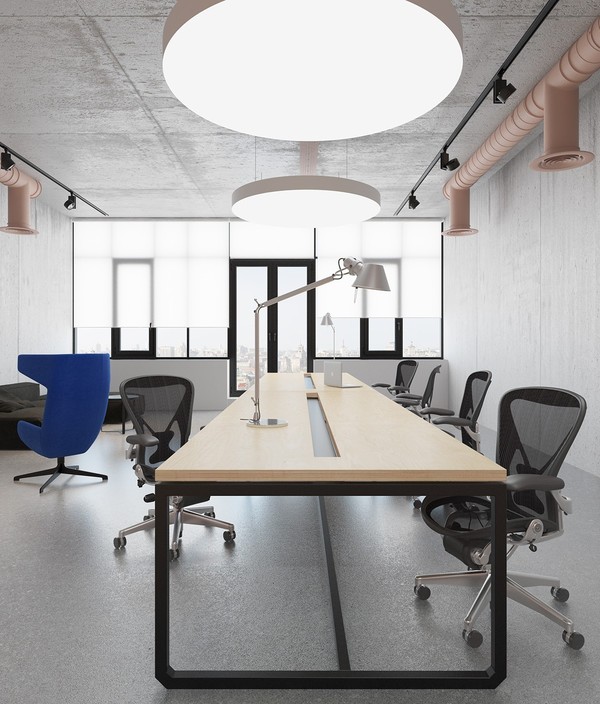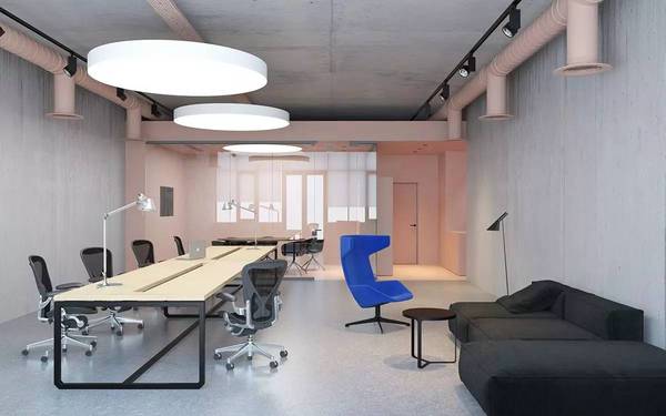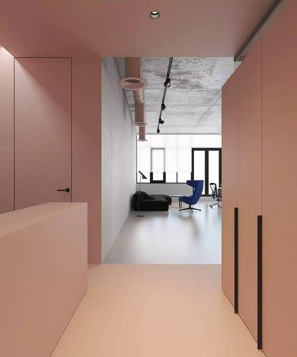 外露的鋼管也被粉刷成粉色,整個(gè)空間采用混凝土鋪陳,從地面延伸至墻面,天花,統(tǒng)一的材質(zhì)讓空間變得簡(jiǎn)潔,干凈,中央擺放著一張長條形的巨型辦公桌,通過淡色木質(zhì)面板以及黑色鐵件塑造出輕盈靈巧的視覺感受。休息區(qū)用黑色轉(zhuǎn)角沙發(fā)搭配鮮艷的寶藍(lán)色單人椅,帶來鮮明的對(duì)比。