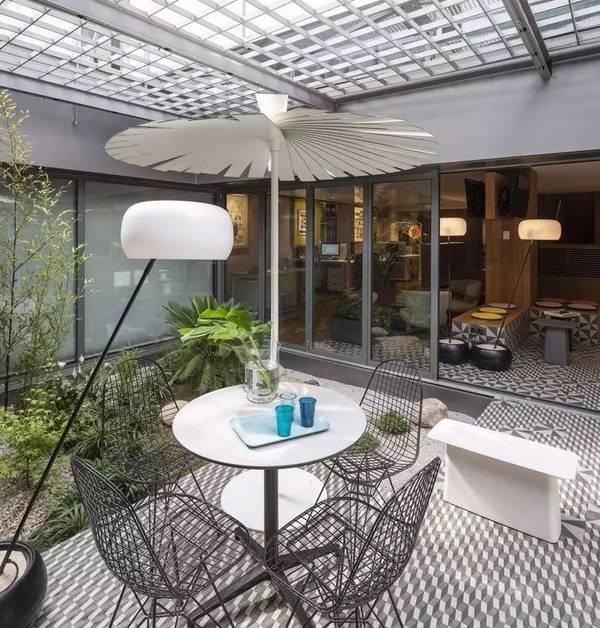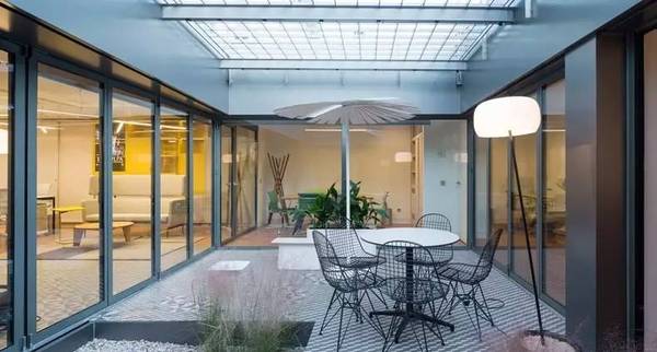 辦公室是建立在一個(gè)室內(nèi)的庭院之中的,雖然辦公空間是圍繞著室內(nèi)的小花園的,但事實(shí)上,室內(nèi)的設(shè)計(jì)與其說(shuō)是辦公室倒更像是圍繞著小花園的休息和活動(dòng)空間。種植著綠色植物的露天小花園中擺放著用以休息閑聊的簡(jiǎn)單的家具,綠色是這里的主題,而用以分隔小花園和辦公空間的既不是堅(jiān)實(shí)的墻壁,也不是活動(dòng)的玻璃門,設(shè)計(jì)團(tuán)隊(duì)選用了落地窗來(lái)包圍這個(gè)公司員工每天都在使用的戶外小空間,以此創(chuàng)造了室內(nèi)外空間的連續(xù)性。