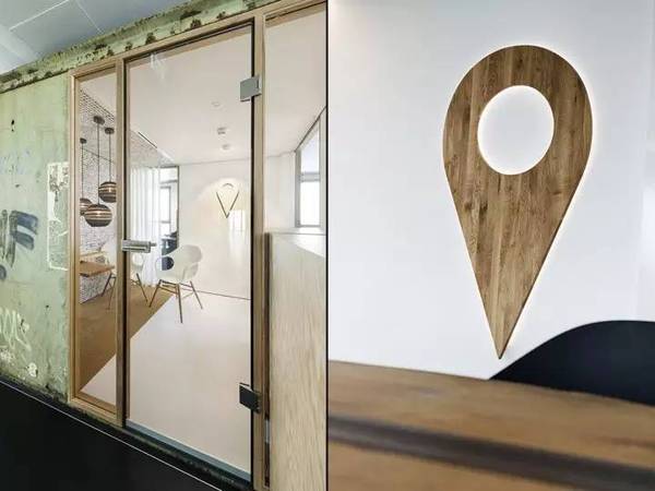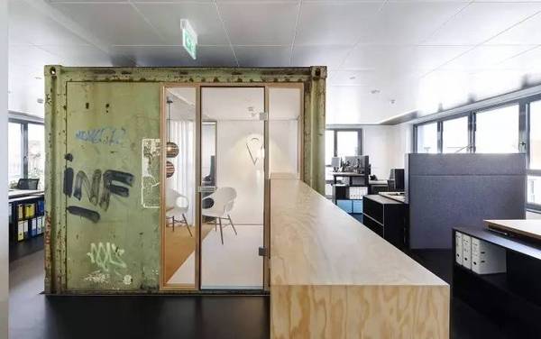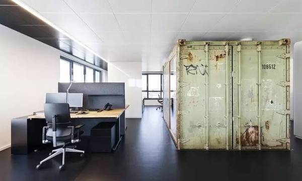 在整個辦公室空間中,與空間“格格不入”的是一個集裝箱,這個有著多次海上經(jīng)歷的集裝箱成為辦公室的亮點,在辦公室施工階段,集裝箱被吊進室內(nèi),成為內(nèi)部的一間會議室。
