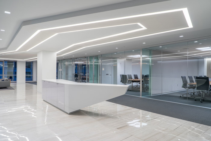 律師事務(wù)所前廳設(shè)計(jì):前廳區(qū)域比較開闊,大氣、自信、優(yōu)雅的特征自然流出,同時(shí)多處采用對稱布局,更顯企業(yè)氣勢。將前臺空間按照2:6:2的比例將空間劃分為3個(gè)區(qū)域,左側(cè)為等待區(qū)域、右側(cè)為接待區(qū)域、中間為前臺區(qū)域,其中留白是本空間設(shè)計(jì)的一大亮點(diǎn),看似簡單的設(shè)計(jì),實(shí)則功能齊全。