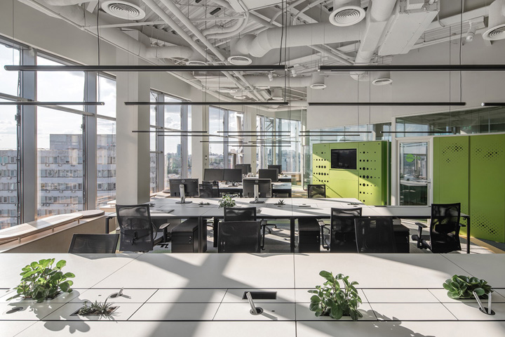 3、混搭風格辦公室設計:原始的混凝土柱和墻壁,以及磚飾面營造出工業(yè)外觀。木質(zhì)元素,大理石細節(jié)和經(jīng)典的簡約家具則增添了許多優(yōu)雅。線性照明和聲學結構在開放的白色天花板下動態(tài)布置,營造出現(xiàn)代寬敞的內(nèi)部空間,激發(fā)創(chuàng)造性工作。