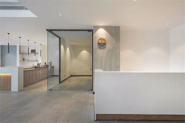 300平loft風(fēng)格辦公室前臺(tái)設(shè)計(jì):前臺(tái)是根據(jù)空間的實(shí)地情況進(jìn)行的布局設(shè)計(jì),此處位于幾個(gè)空間的交匯處,設(shè)計(jì)師一方面希望凸顯前臺(tái)的屬性,另一方面此處也有返璞歸真的樸素蘊(yùn)含在其中。