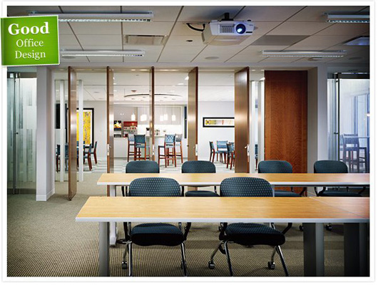 改造后:門后的休息室與培訓(xùn)室想通,窗戶引入的自然光與室內(nèi)燈光有起居室的感覺(jué)。空間也可以靈活應(yīng)用,門移至一邊,則變成一大間。
