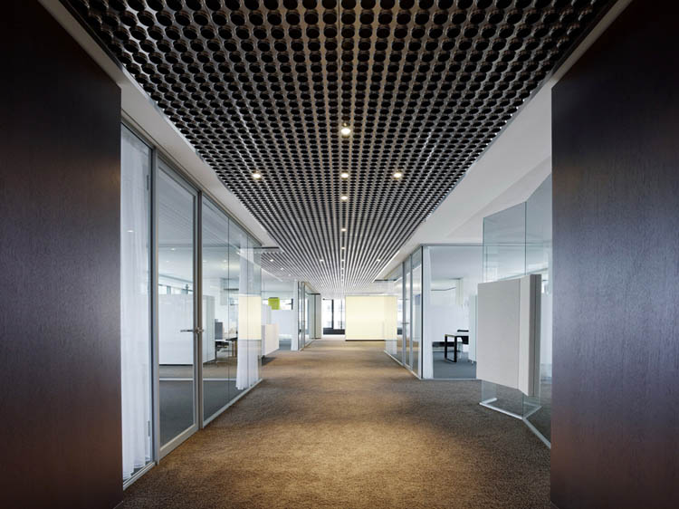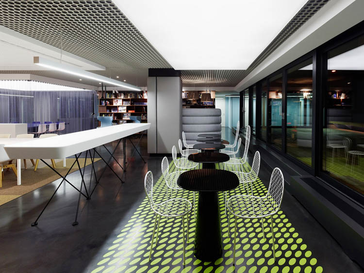 其概念是設(shè)置一個(gè)為所有部門共用的交流空間,以及滿足不同協(xié)作需要的不同分區(qū)。原先單獨(dú)、分散化的辦公室變成大型開(kāi)放式的辦公空間,鼓勵(lì)同事之間的交流。每一個(gè)樓層都有單獨(dú)的辦公室和單獨(dú)的工作組空間,以及大型開(kāi)放式工作間。各個(gè)工作站的工作人員能夠相互交流。玻璃立面的辦公室中,十字形的結(jié)構(gòu)將開(kāi)放式的空間分隔為各個(gè)單元,但又是集中的工作環(huán)境。一系列暖色調(diào)的材料營(yíng)造出不同的氣氛,有時(shí)候讓員工感覺(jué)到像在家里一樣。辦公樓中的地毯有著清晰的路徑指示和功能分區(qū)。就餐區(qū)地板上的綠點(diǎn)如同變魔術(shù)一樣變出草地的效果,構(gòu)筑起通向露臺(tái)的一道概念式的橋梁。向露臺(tái)打開(kāi)的半圓形裝飾空間與其他部分區(qū)分開(kāi)來(lái),透明的蕾絲幕布構(gòu)成了半私密的空間,而清新的色彩、深藍(lán)色的桌子和粉色的地毯,無(wú)不為員工帶來(lái)激發(fā)工作情緒的氛圍。
